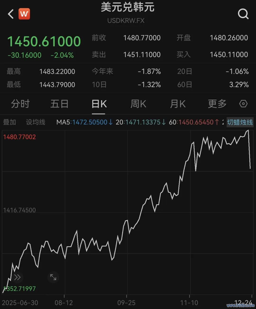 受上述音讯刺激,韩元汇刚直线爆拉,日内一度暴涨2.5%,最高升至1好意思元兑1443.79韩元。在此之前,韩元一度贬值至1好意思元兑1485韩元,靠近2009年专家金融危急以来的最低水平。